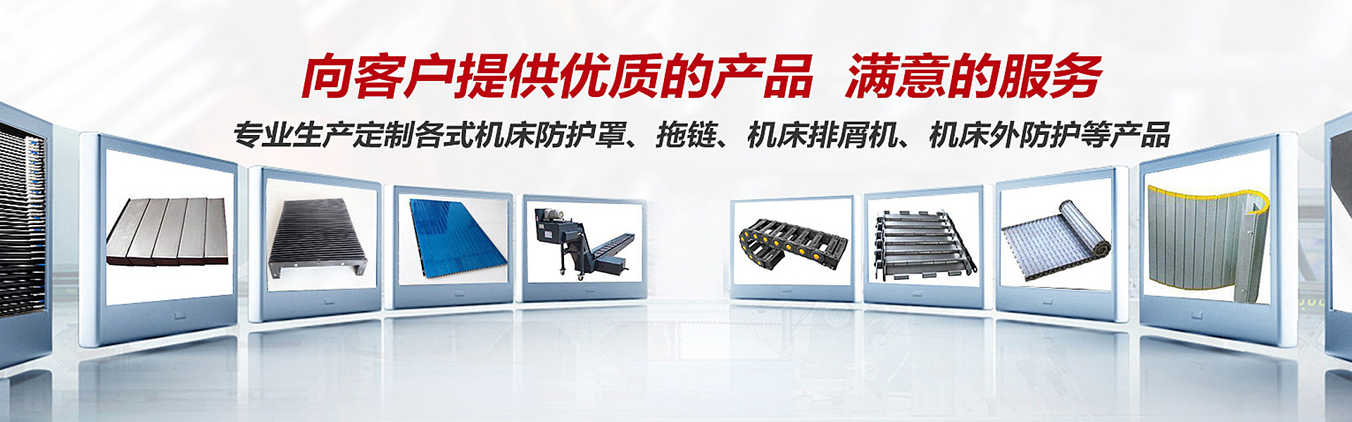 主要產品有:鋼板伸縮式防護罩、新型pvc柔性護罩、風琴式、圓桶式、鎧甲式、卷簾式伸縮護罩、鋁形防護簾、TL橋式鋼鋁拖鏈、橋式全封閉式工程塑料拖 鏈、矩形金屬軟管護套、DGT導管護套、螺旋鋼帶護套、機床導軌刮屑板、T型撞塊槽板、可調塑料冷卻管、S78系列機床墊鐵等。